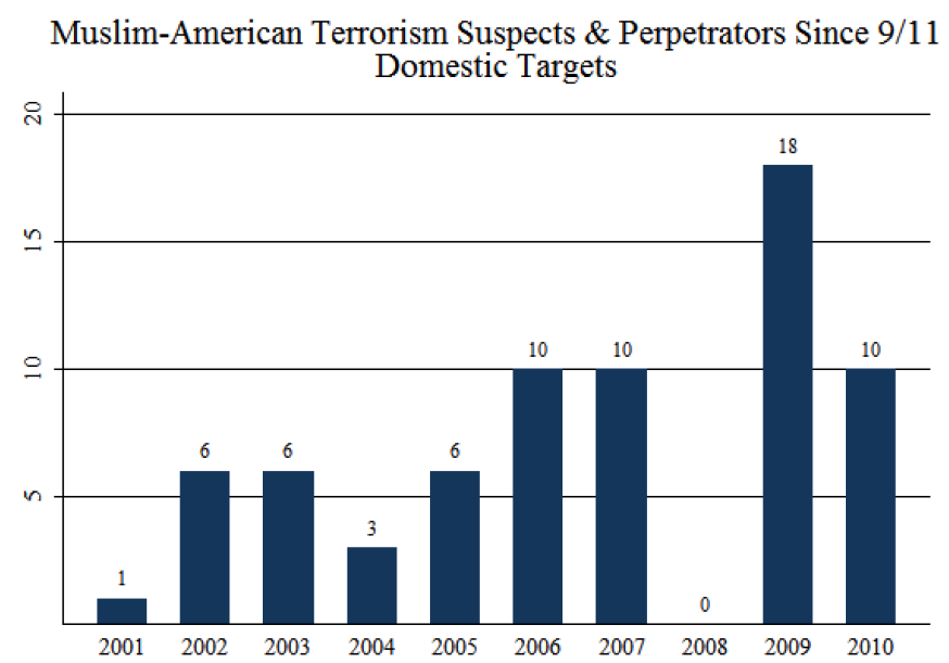 committed by American Muslims in the years since 9/11 (Triangle Center on Terror and Homeland Security, Figure 2).  This attempted terrorism is considered a strong indicator of radicalization.  (It is important to note that the number of terror attempts dropped by half, despite the fact that the attempts received more media attention.)