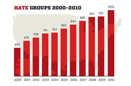 An increase in radicalization, however, cannot only be ascribed to members of the Muslim community.   In 2010, the number of hate groups operating in the US reached its peak, topping 1,000.  Some of these groups include neo-Nazis, white nationalists, neo-Confederates, racist skinheads, Klansmen, and black separatists (Southern Poverty Law Center).  “Other hate groups on the list target gays or immigrants, and some specialize in producing racist music or propaganda denying the Holocaust,” the center’s report also says.