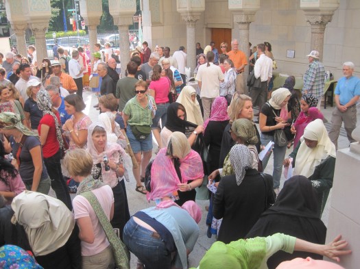 Many American women misunderstand Islamic covering and feel that it is demeaning, and knowing this I was overwhelmed almost to tears by the enthusiasm of these non-Muslim women, who chose to cover themselves to enter the mosque.  These women chose to challenge the deep assumptions Westerners have about Islam and women, and decided to be open-minded and curious, withholding judgment until they’d had the experience.  While it was clear that all the women were not fully comfortable with covering (myself included—and I cover quite often,) that didn’t stop them from participating or asking questions respectfully.